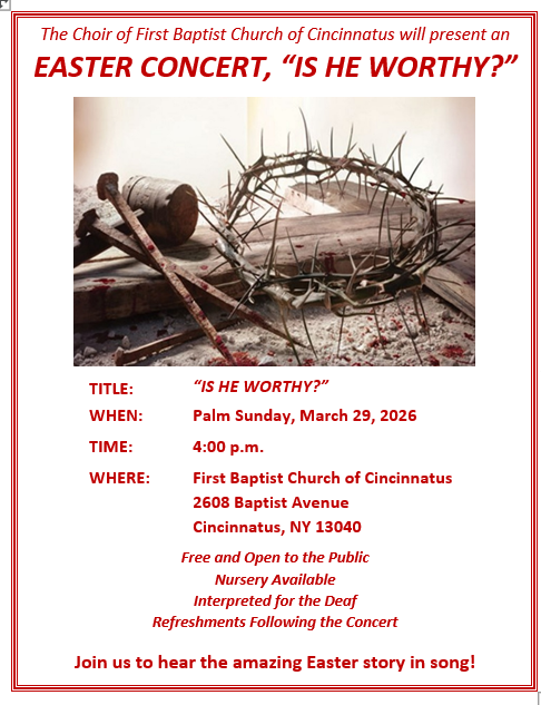 We would love for you to visit us sometime. First Baptist Church of Cincinnatus is an Independent Baptist fellowship of believers. Our services center on worshiping God through song and sound Biblical preaching of the Word.